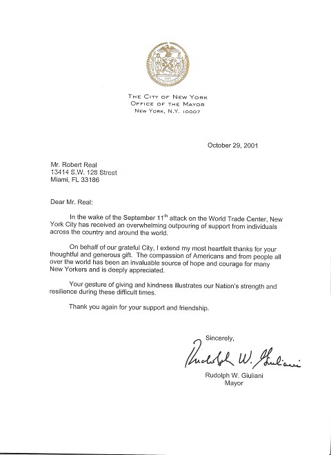 Giuliani's thank-you letter . Loraine even got to present the check to the